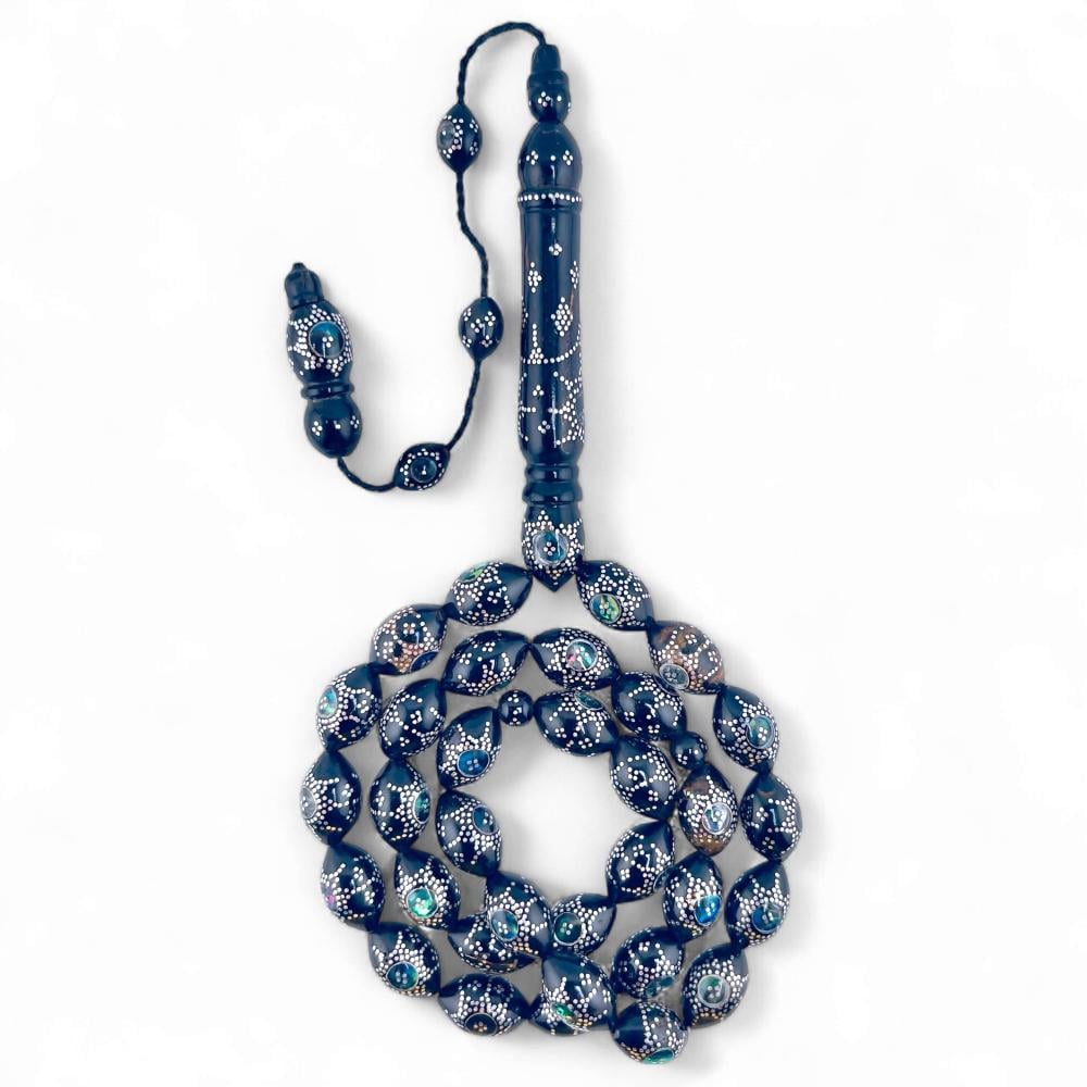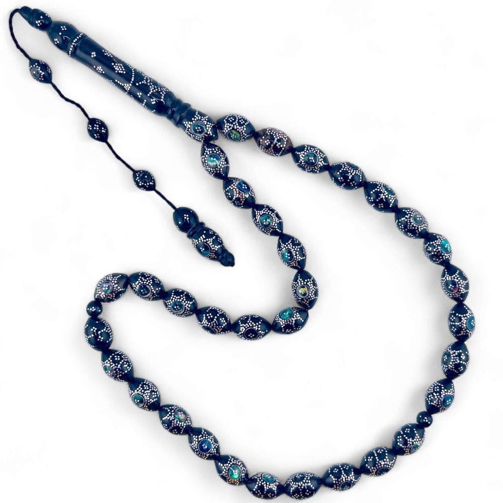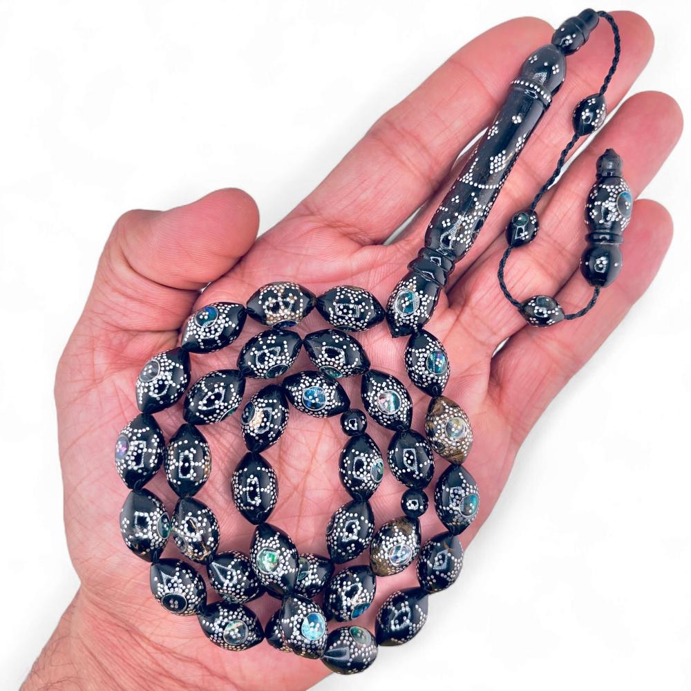 سبحة يسر مطعمة بالفضة عيار 999 و لون الصدف شبيه الاوبال - 33 خرزة 10 ملي