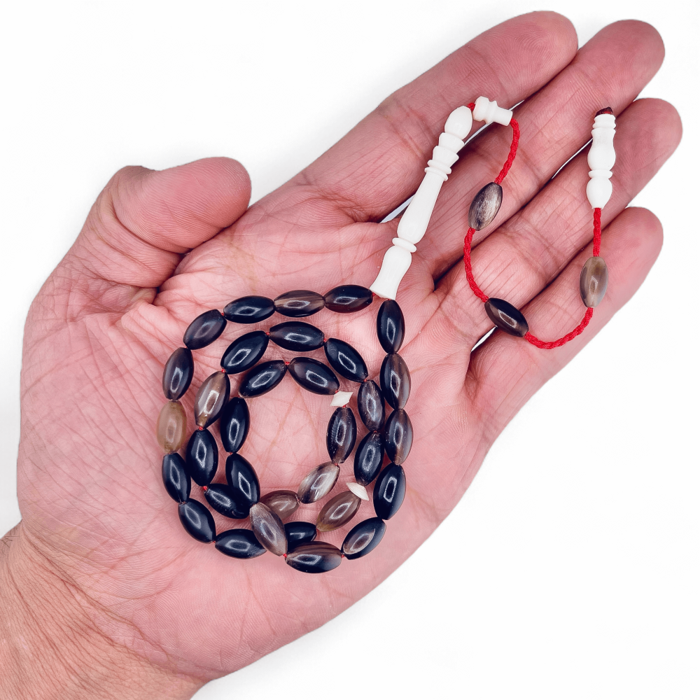 • المادة: قرن جاموس وعظم جمل، مواد طبيعية تمنح السبحة مظهراً فاخراً وملمساً ناعماً.