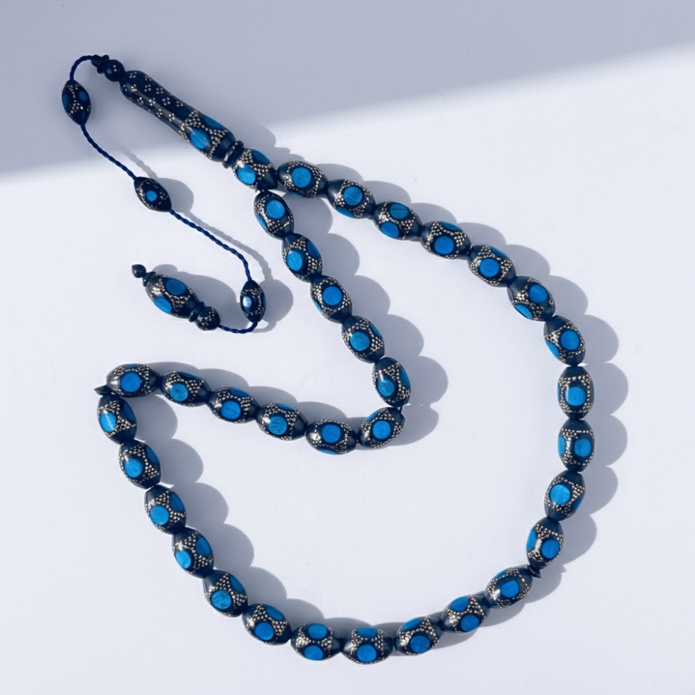 سبحة كوك طبيعي لوكس مطعمة نحاس نقي و لون ازرق - شبيه اليسر - 33 خرزة 10 ملي