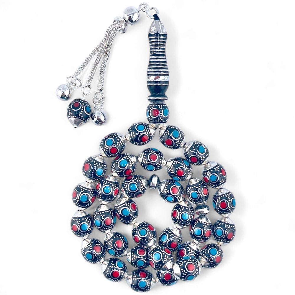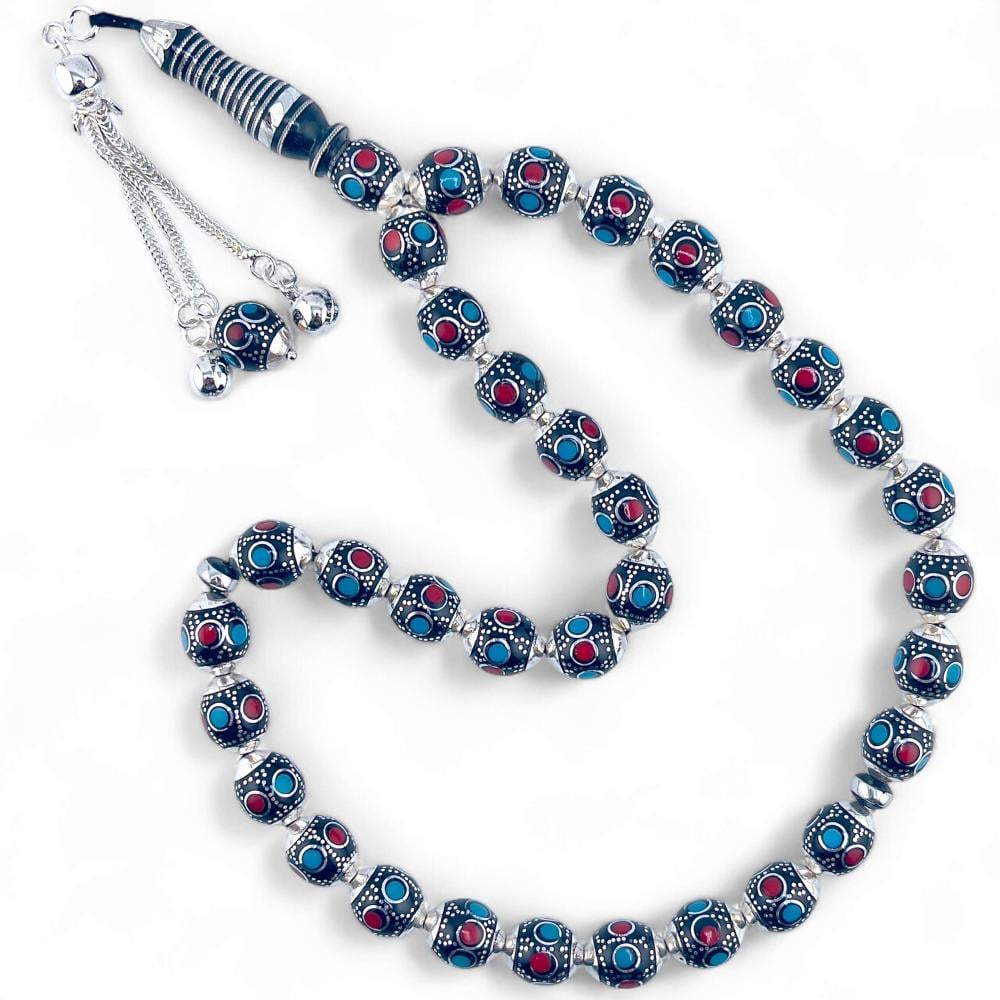 سبحة يسر بالفضة فاخرة عيار 925 مطعمة بلون الفيروز والمرجان - 10 ملي: إطلالة فاخرة لعشاق التميز