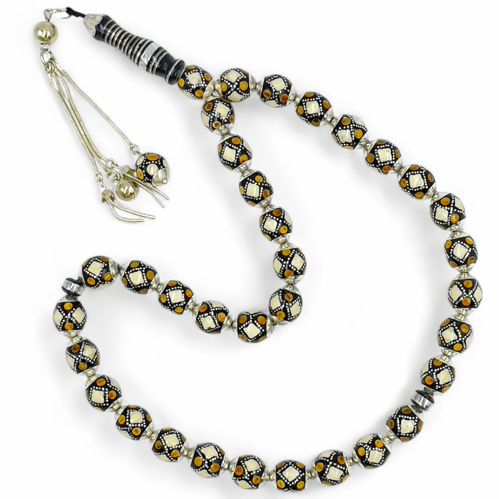 سبحة يسر مطعمة بالفضة والعاج و الكهرمان الطبيعي - تصميم عصري وفريد - 10 ملي