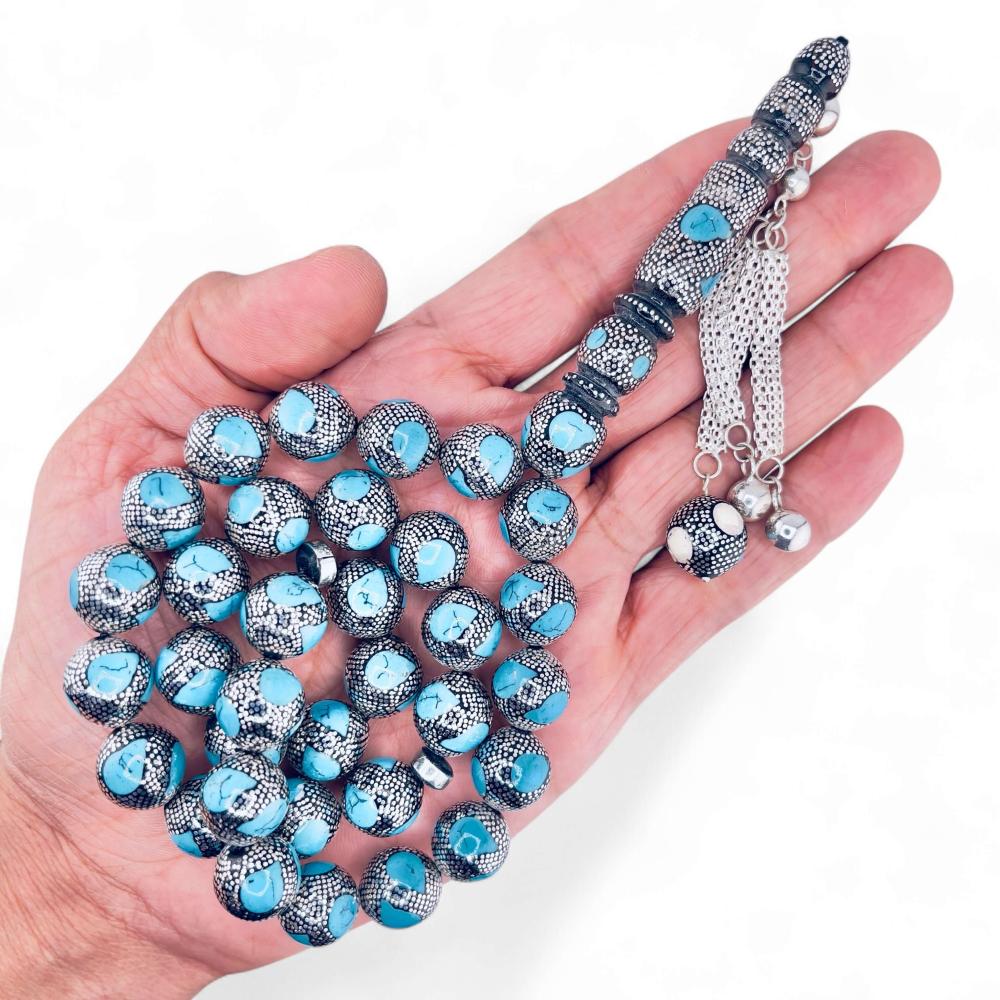 تألّق بذوقك واختياراتك مع سبحة يسر فاخرة مطعّمة بكوك طبيعي، فضة عيار 1000، وحجر الفيروز الأصيل.ليست مجرد سبحة، بل قطعة فنية تعبّر عن الرقي والفخامة، وتُعد هدية مثالية تحمل قيمة معنوية وجمالية عالية لكل من تهديه.
