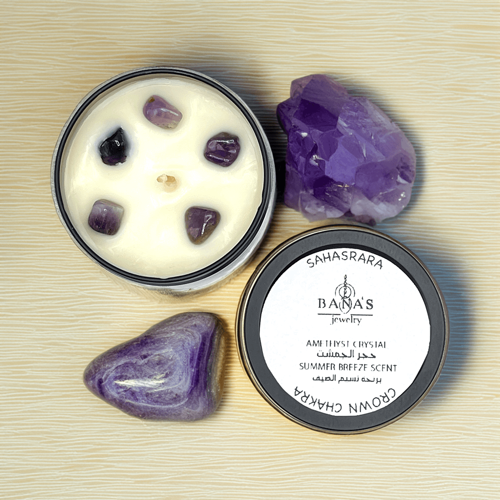 شمعة بانا جولري بحجر الأماتيست لتنشيط شاكرا التاج، مصنوعة من شمع الصويا الطبيعي وزيت عطري برائحة نسيم الصيف. توفر 20 ساعة من الرائحة العطرية والاسترخاء.