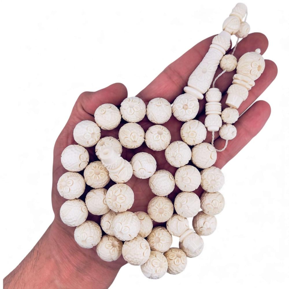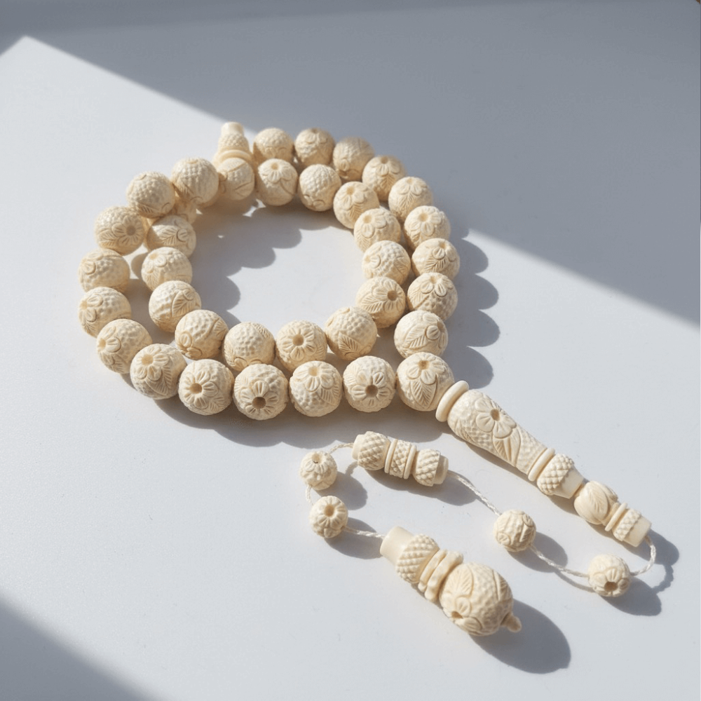 سبحة عاج ناب الفيل طبيعي منقوش نقش يدوي احترافي - 16 ملي 33 خرزة