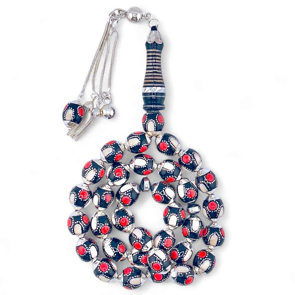 سبحة يسر بالفضة فاخرة عيار 925 مطعم بلون المرجان و العاج - 10 ملي