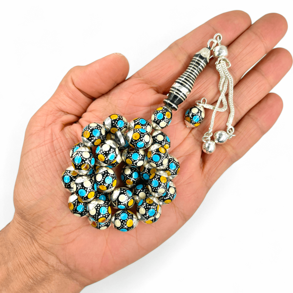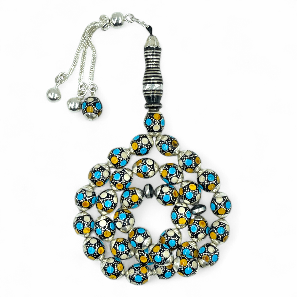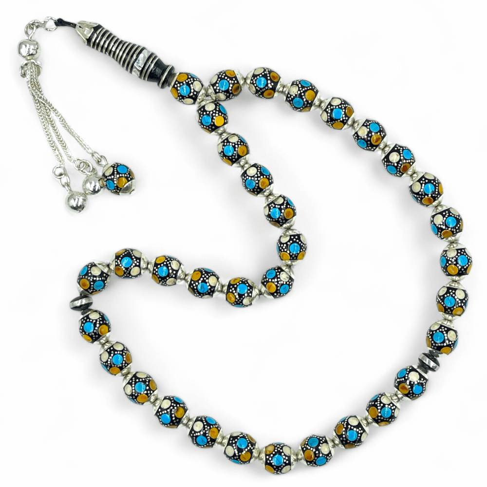 سبحة يسر مطعمة بالفضة عيار 925 و بالكهرمان و عاج و فيروز 10 ملي